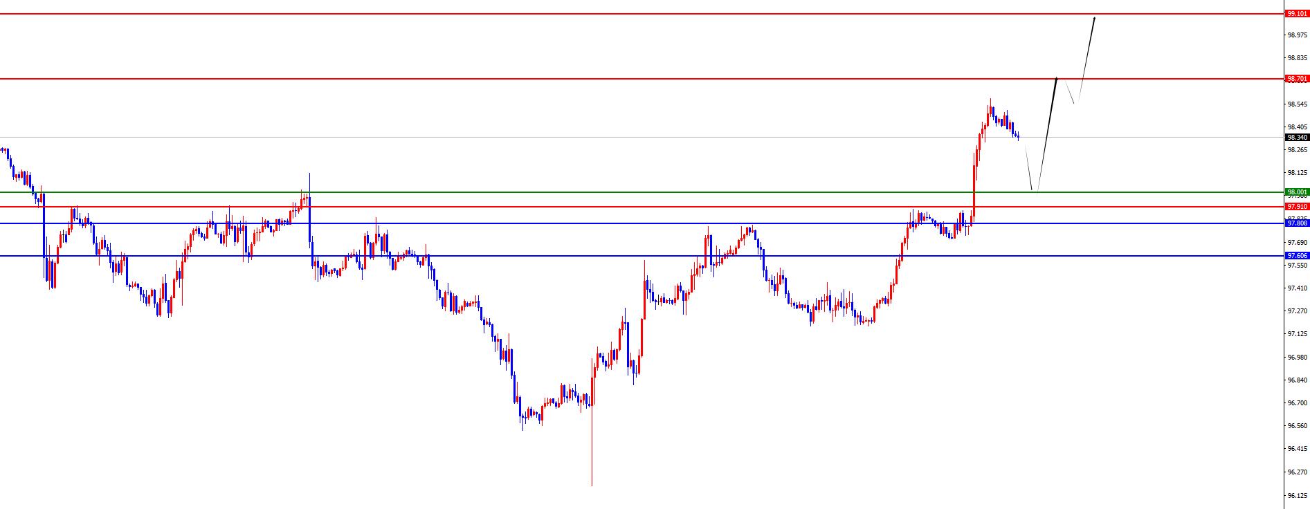 From a multi-cycle analysis, the price has been consolidating in the weekly level recently. Currently, the weekly line supports the 97.80 area, and at the same time, the price has been in the last weekly resistance yesterday. As long as the market closes above this position, the bulls will continue in the medium term. From the daily level, as time goes by, the daily line is currently supported in the 97.60 area, and the band above this position of the price has further risen. From the four-hour perspective, the current four-hour support is at the 98 position. We will pay attention to further rising support in this area. At the same time, the price will adjust downward in the short term in one hour. After the subsequent adjustment to key support, we will look at further rises. Pay attention to the 98.70-99.10 area above.