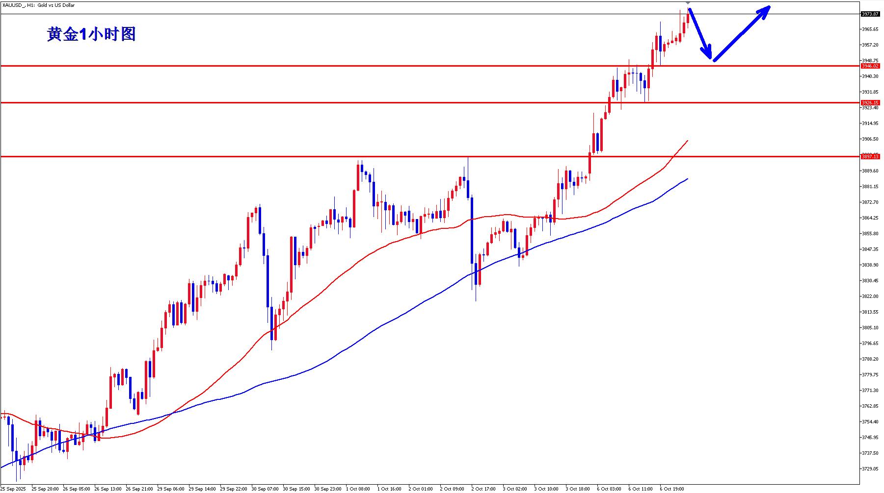 The gold 1-hour moving average continued to spread upwards with the bulls, and the bulls were full of strength. Gold continued to rise after the US market fell back to the 3946 line last night. Then it fluctuated in the second half of the night to accumulate momentum. Gold woke up and hit a new high. Gold did not break 3946 today, so gold fell back in the early trading and continued to go long.