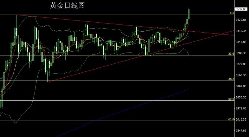 昨日黄金市场早盘开盘在3478.3的位置后行情先拉升破位历史高点3500后给到了3509.2的位置后行情短期获利了结回落,日线最低给到了3469.7的位置后美盘时段受到基本面推升行情强势拉升,日线再破历史高点后最高触及到了3540.6的历史新高后行情整理,日线最终收线在了3532.6的位置后行情以一根上下影线等长的大阳线收线,而这样的形态收尾后,日线有效破位3500高度,日线完成N字破位,今日的行情回踩延续多,点位上,下方3325和3322的多和上周3368-3370的多和3377和3385多减仓后止损跟进在3420,今日3512多保守3509多止损3505,目标看3532和3541,破位看3550和3562-3573.