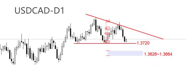 技术走势看,USDCAD处于空头趋势的筑底阶段,目前的阶段性低点在6月16日形成的1.3538点。中短期来看,USDCAD的支撑位在图中1.3720处,最新市价1.3755,距离支撑位较近。由于今日美盘时段存在加拿大央行和美联储的双利率决议局面,预计今日K线振幅较大,有可能突破1.3720点。一旦支撑位被有效突破,下方新的支撑区间在1.618~1.382附近,对应1.3626~1.3664点,建议重点关注。