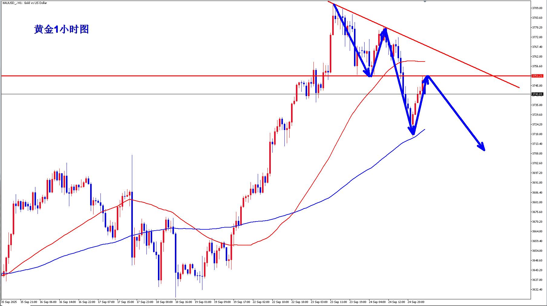 黄金1小时均线已经开始拐头,黄金多头短暂承压,黄金昨天跌破3750一线之后,黄金短期3750也成为多空的分水岭,如果黄金早盘继续承压3750下,那么黄金还是继续空,黄金1小时现在已经是震荡下跌的走势,短线承压,黄金早盘反弹3750附近之后,也并未站稳3750一线,黄金3750附近还是可以继续空。